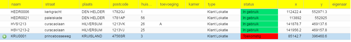 Door op een regel te klikken selecteert u het object, in dit voorbeeld het gebouw KRU0001. Door op een regel te dubbelklikken, of twee keer snel achter elkaar te tikken op een tablet, opent u het ‘Bewerk’ venster.